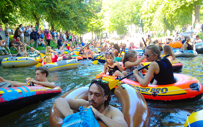 Grabbing everything that could floated we made our way (using two tennisrackets as oars) to the startingpoint. On our way we even picked up a Ukrainian girl which was experiencing her first day in the Netherlands. And an experience she got! Arriving at the startingpoint, the water was filled with rubber boats of all shapes and sizes with a uplifting atmosphere surrounding the whole group. As we made our way through the canals, drinks food were shared, oncoming canal-touringboats were being raided and onlookers (plus our Ukrainian guest) were being baffled by all the crazy Dutchness.