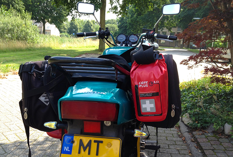 Since I’ve been living with myself for quite some time, I have some experience with the man that is Robert Jan when it comes to travelling. Meaning I always find a way to; burn, sprain, drain, cut or in any other way damage my physical entity. Thus I have taken some precautions by adding multiple first aid-kits in my luggage, with the most important one attached on the back of my motorcycle in clear view and with easy access. The main idea being that I’m in need of assistance, a trespasses can easily identify the medical kit.