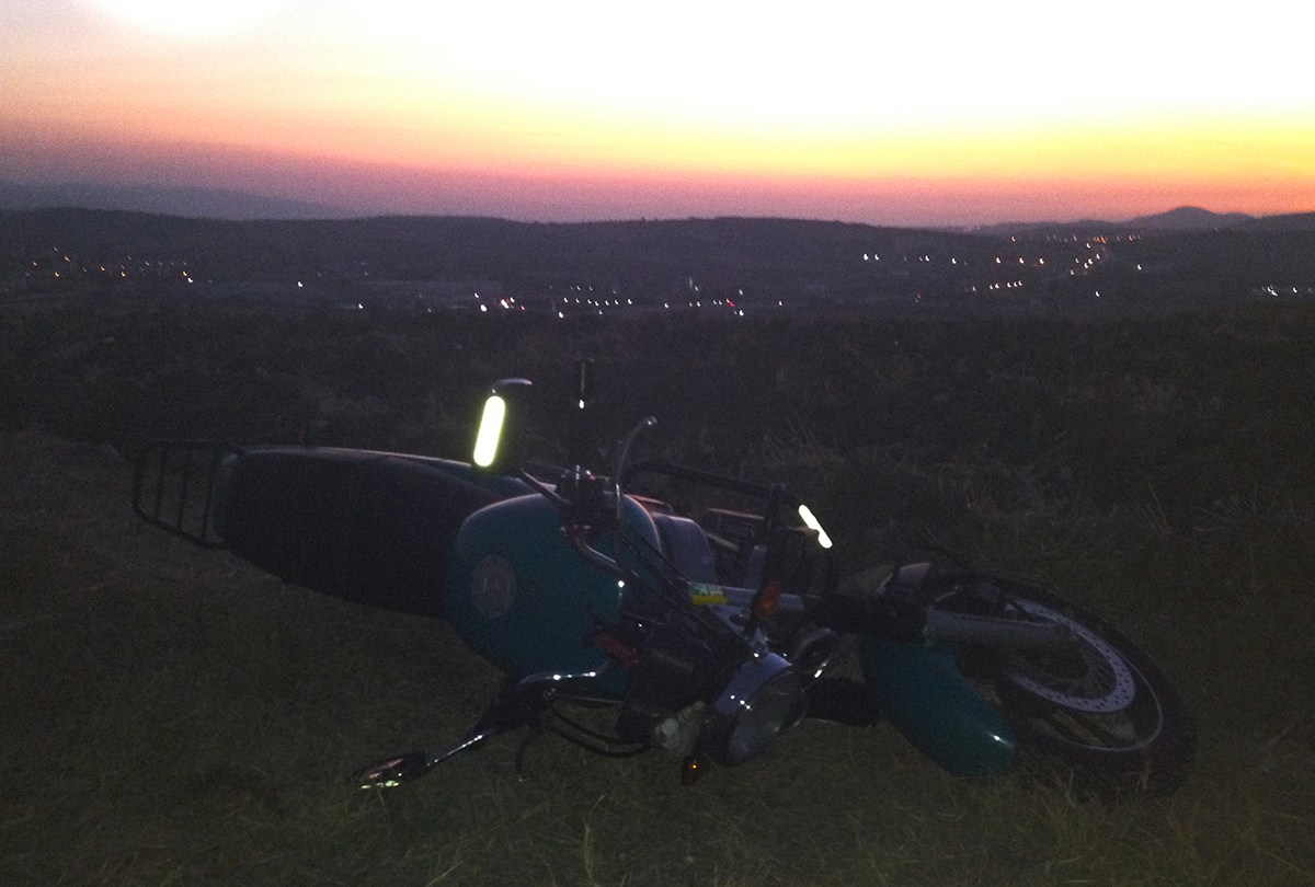 While waiting for our shared departure, I decided to take the bike out for an evening ride. Then I saw a little dirt road that I just had to take. At some point it got a bit too dark to see the road and my wheel got caught in a ditch. Perry tumbled down and decided to lay down on the ground, where I could only laugh and enjoy the beautiful sunset at the horizon. After a few minutes of enjoying the sight I slowly dragged the front wheel out of the ditch, pushed Perry in his usual vertical position and rode of again.